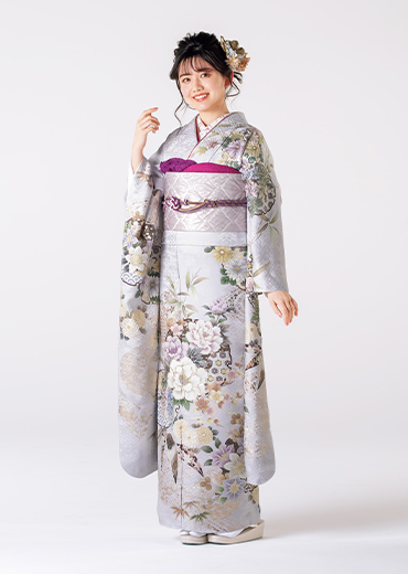 振袖はピンク色を帯びた淡い紫色が基調。牡丹や藤の花が舞う柄が、品格と優美さを漂わせます。春を空気をまとうような一枚は、晴れの日にぴったりです!