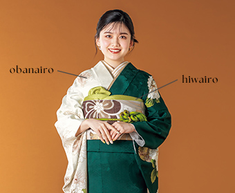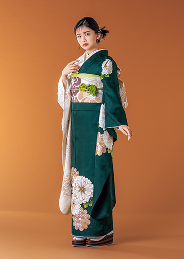 振袖は深みのグリーンに落ち着いた白を合わせたツートーン。シンプルでありながら、ファッショナブルな世界観が印象的です。