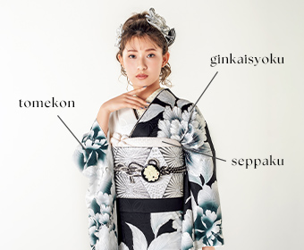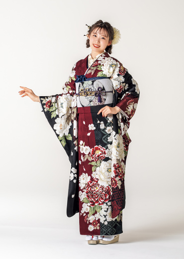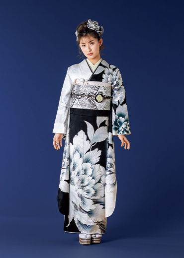 振袖はグレーを帯びた紺色と秀麗な白との組み合わせで、洋テイストの牡丹がドレスのような美しさを演出し、クラシカルでありながらモダンな着こなしを叶えます。
