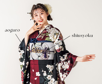 振袖は黒みを帯びた深蘇芳に黒の染め分けを施し、紋様をより一層引き立てるデザイン。重厚感とオリジナリティーが融合し、心が満たされる一枚です。